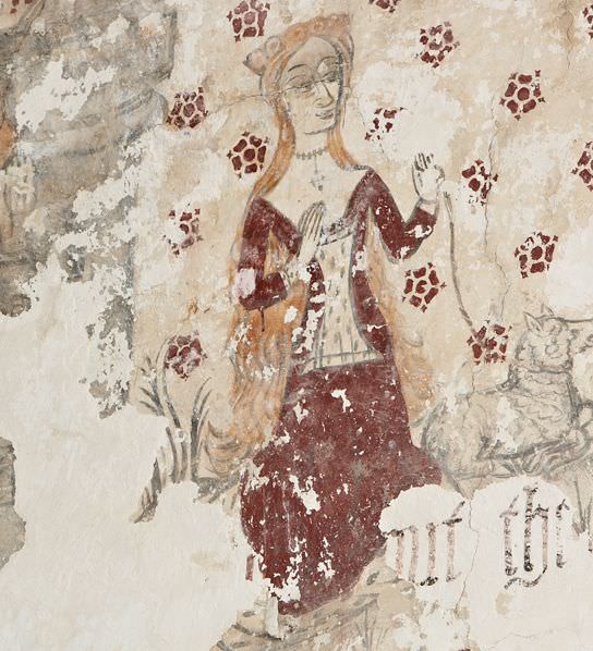During recent conservative repairs, the project Architect discovered signs of an exceptional and previously unknown medieval wall painting. Whilst only small areas are visible at present, the principal subject appears to be the largest known painting of 'St.George and the Dragon' in Wales, and is possibly amongst the largest and best preserved in Britain.